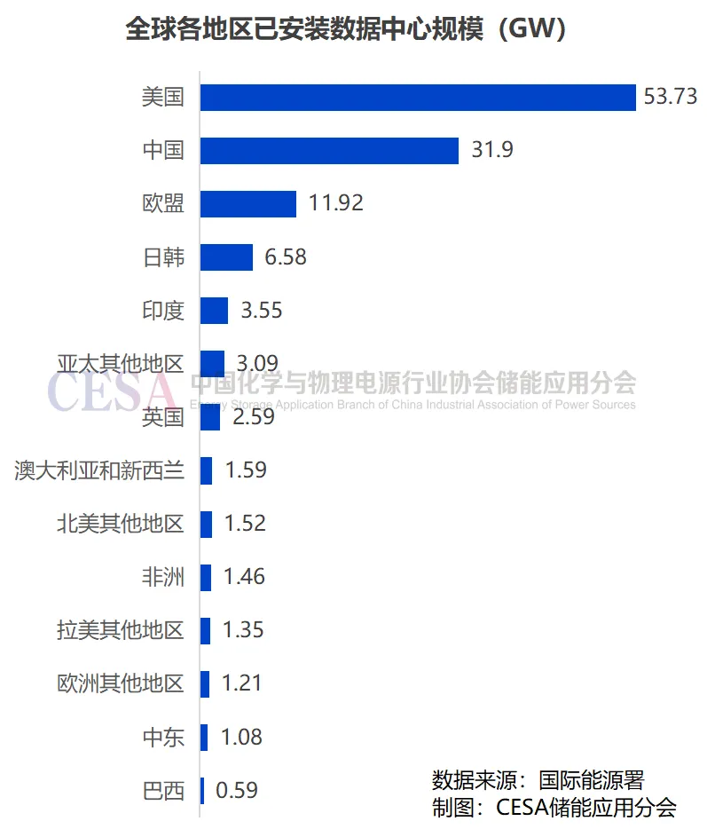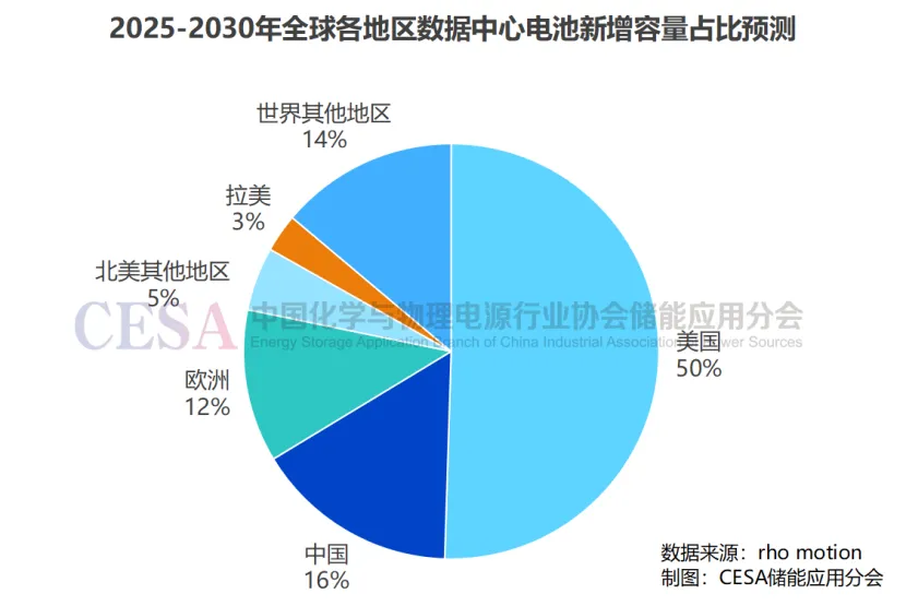 另据Rho Motion发布的2025年第二季度电池储能预测报告,到2030年,全球数据中心的电力需求预计将增长超过180%,其中很大一部分将来自美国,预计美国将占新增储能系统(BESS)需求的一半以上,中国则是全球第二大市场。欧洲作为第三大市场,随着英国和德国等国数据中心容量的扩建,也将迎来增长。