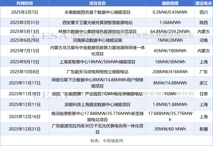 表 2025年部分并网的数据中心储能项目