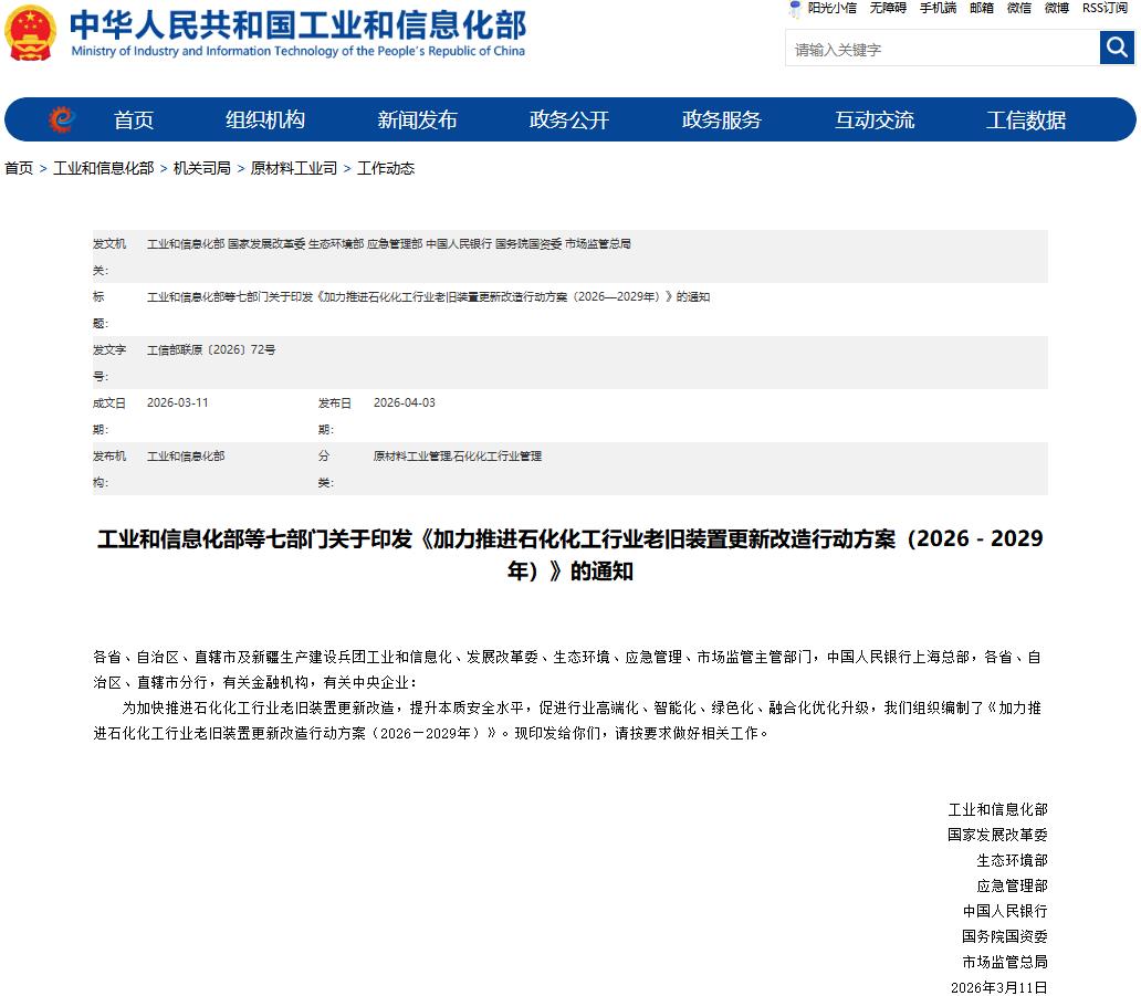 近日,工业和信息化部、国家发展改革委、生态环境部、应急管理部、中国人民银行、国务院国资委、市场监管总局等七部门联合印发《加力推进石化化工行业老旧装置更新改造行动方案(2026-2029年)》(以下简称《行动方案》)。